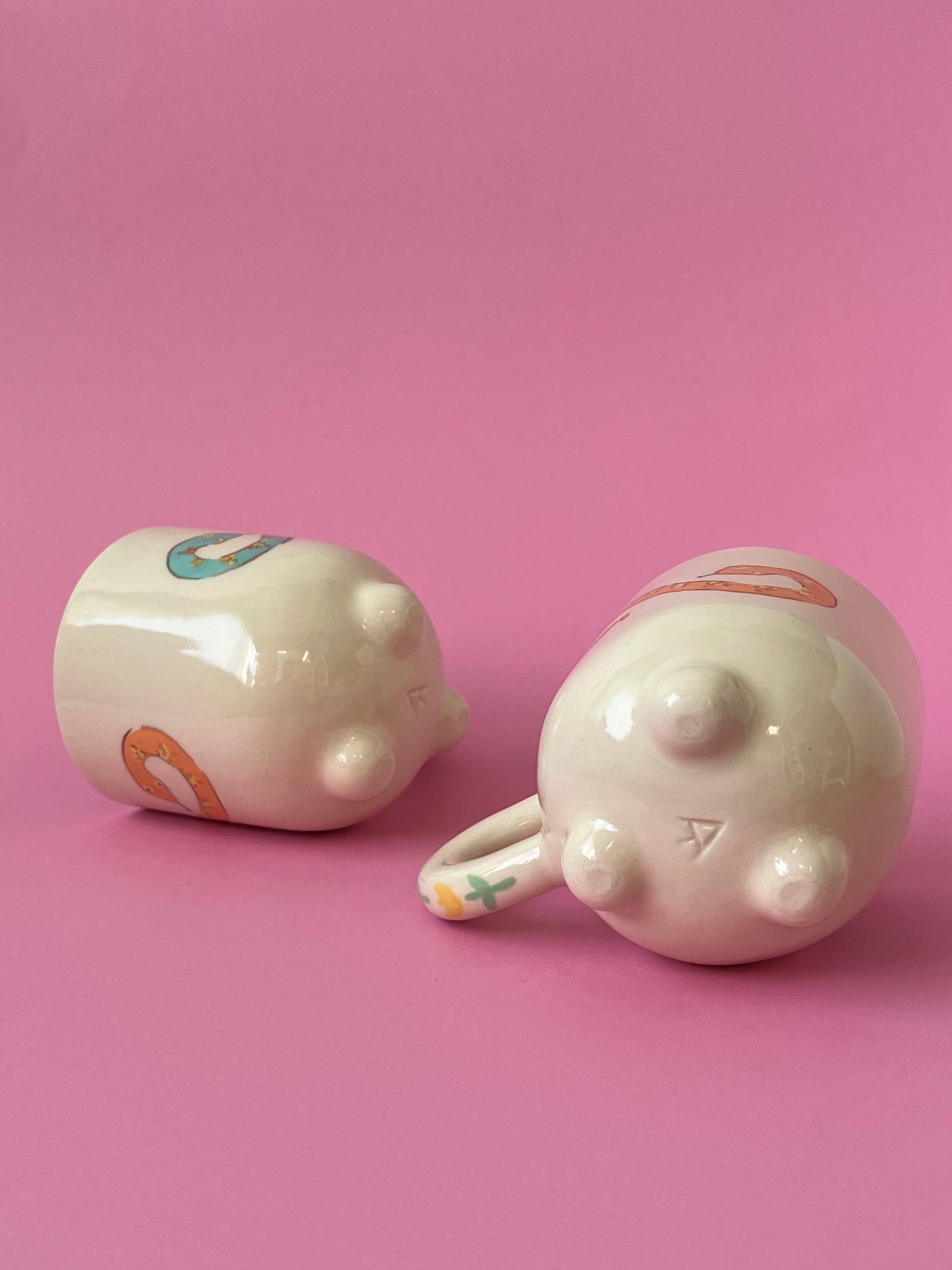 Snake Mugs are slip cast mugs ~ light with a chunky handle and little rounded feet.. Mugs are hand painted with a sweet little snake buddy, gilded with gold luster outlines and fired 3 times in my tiny 1.5 sq foot kiln on Agricola Street. Each hand illustrated snake mug is similar but unique! all are hand made, slight variations in form can be expected.