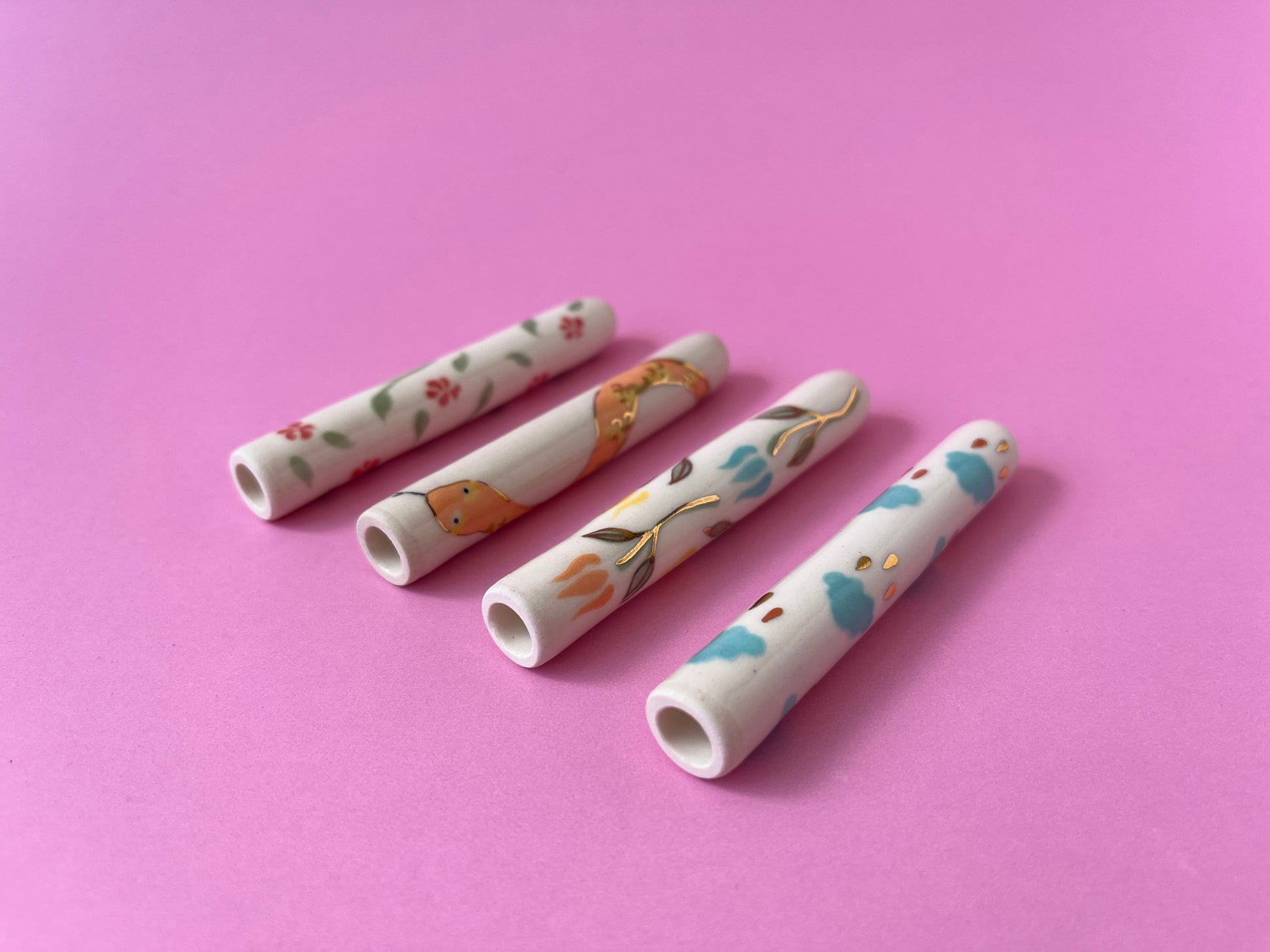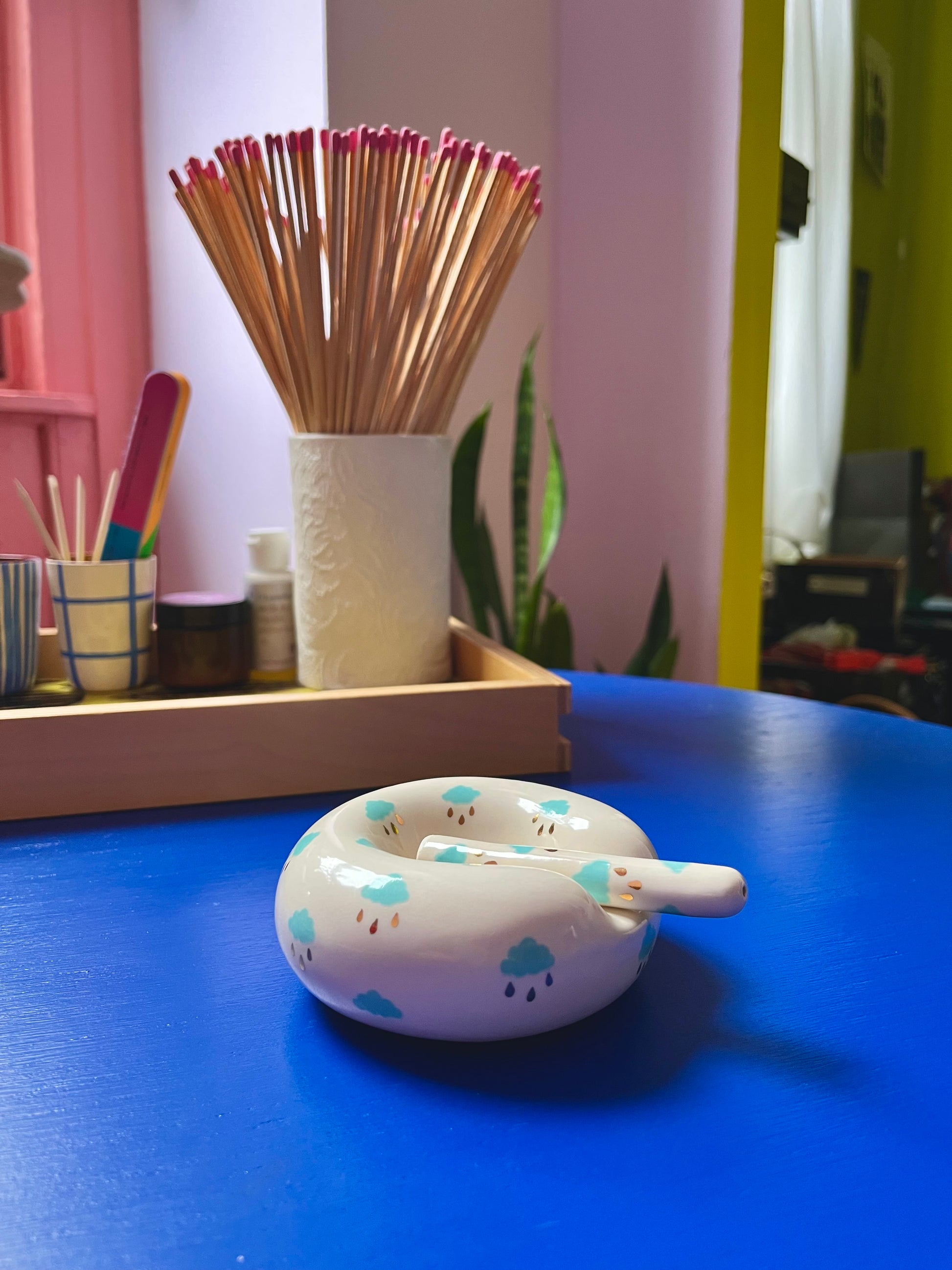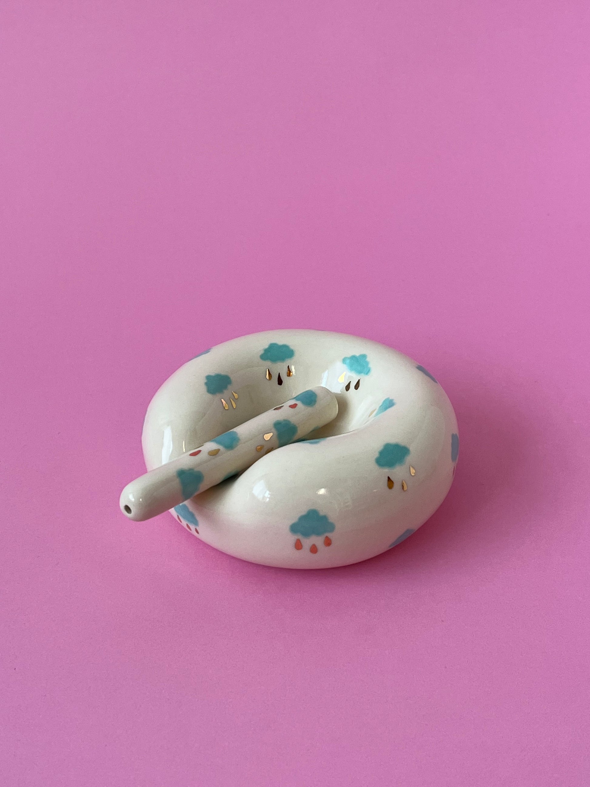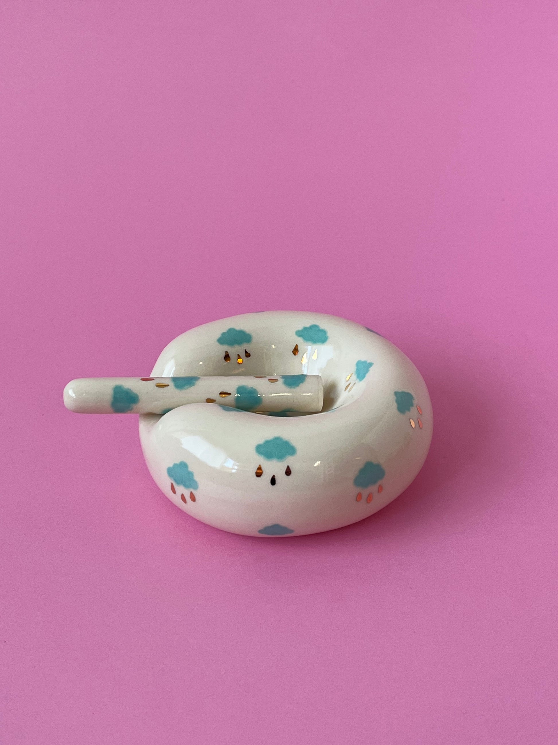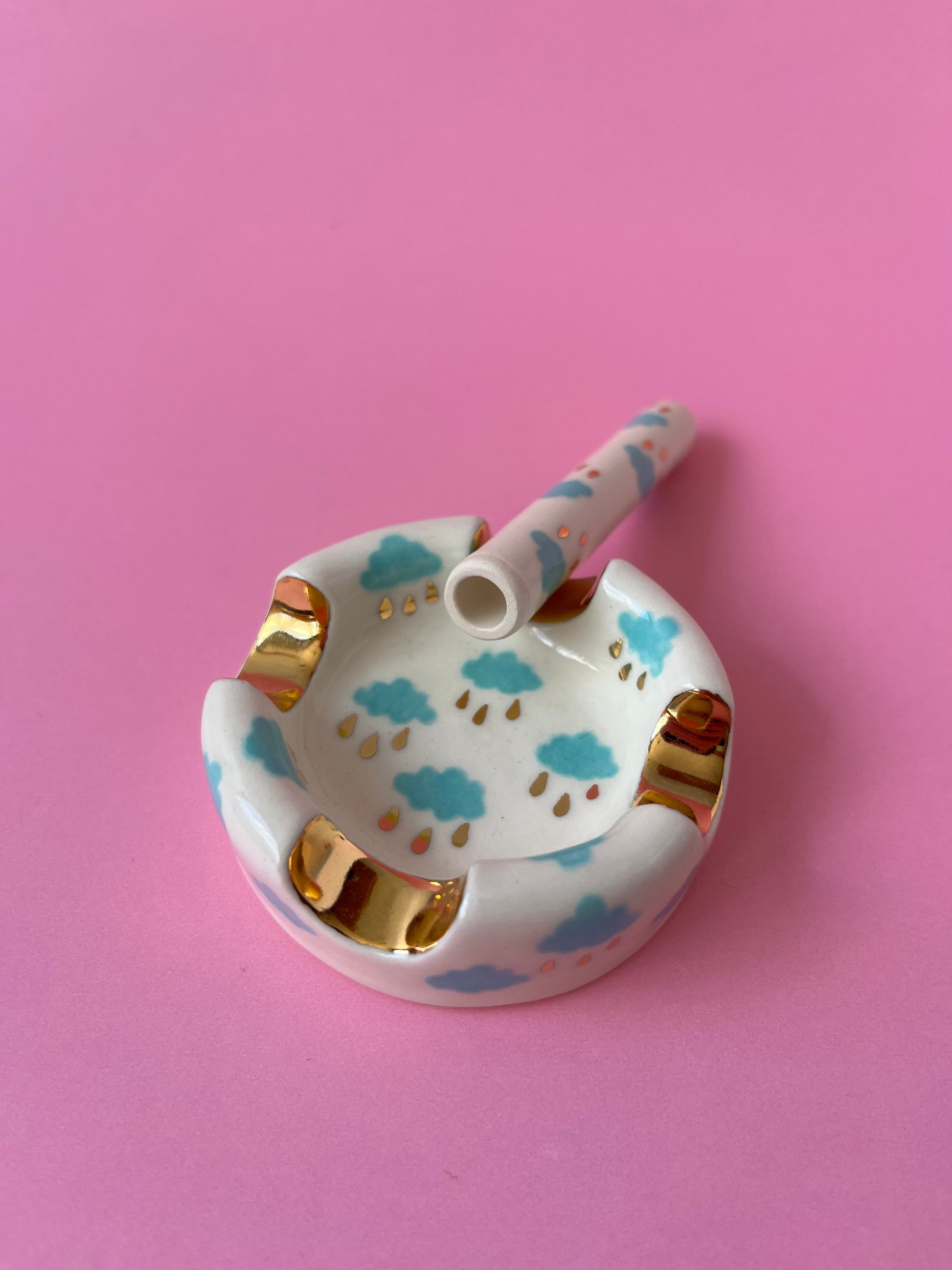 Slipcast high fire ceramic and hand painted with blue colours with (20k) gold lustre raindrops. Fired three times in a little kiln in a sunny studio in Halifax Nova Scotia, Canada.